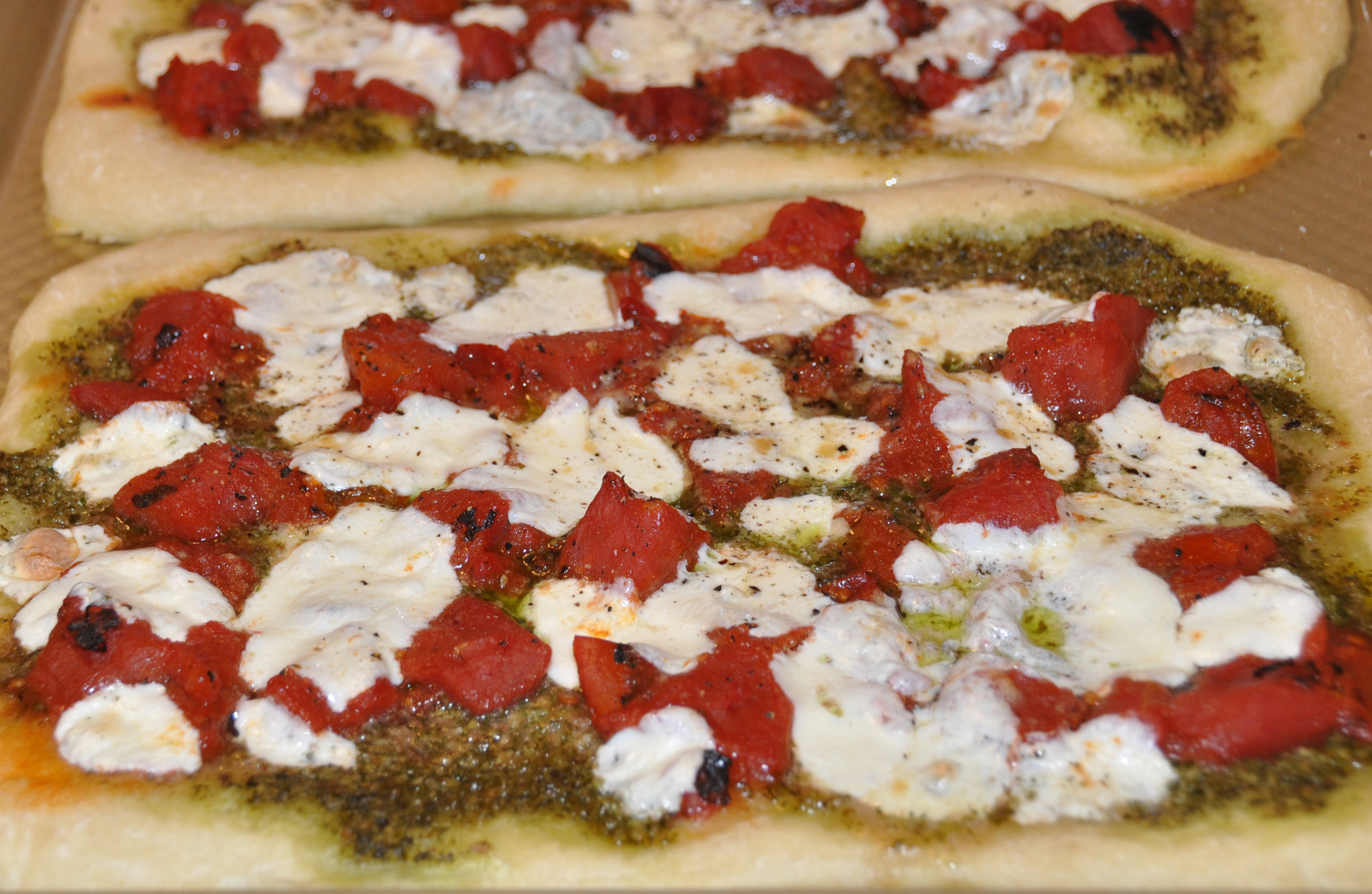 Pizza with Pesto, Fire-Roasted Tomatoes, and Mozzarella