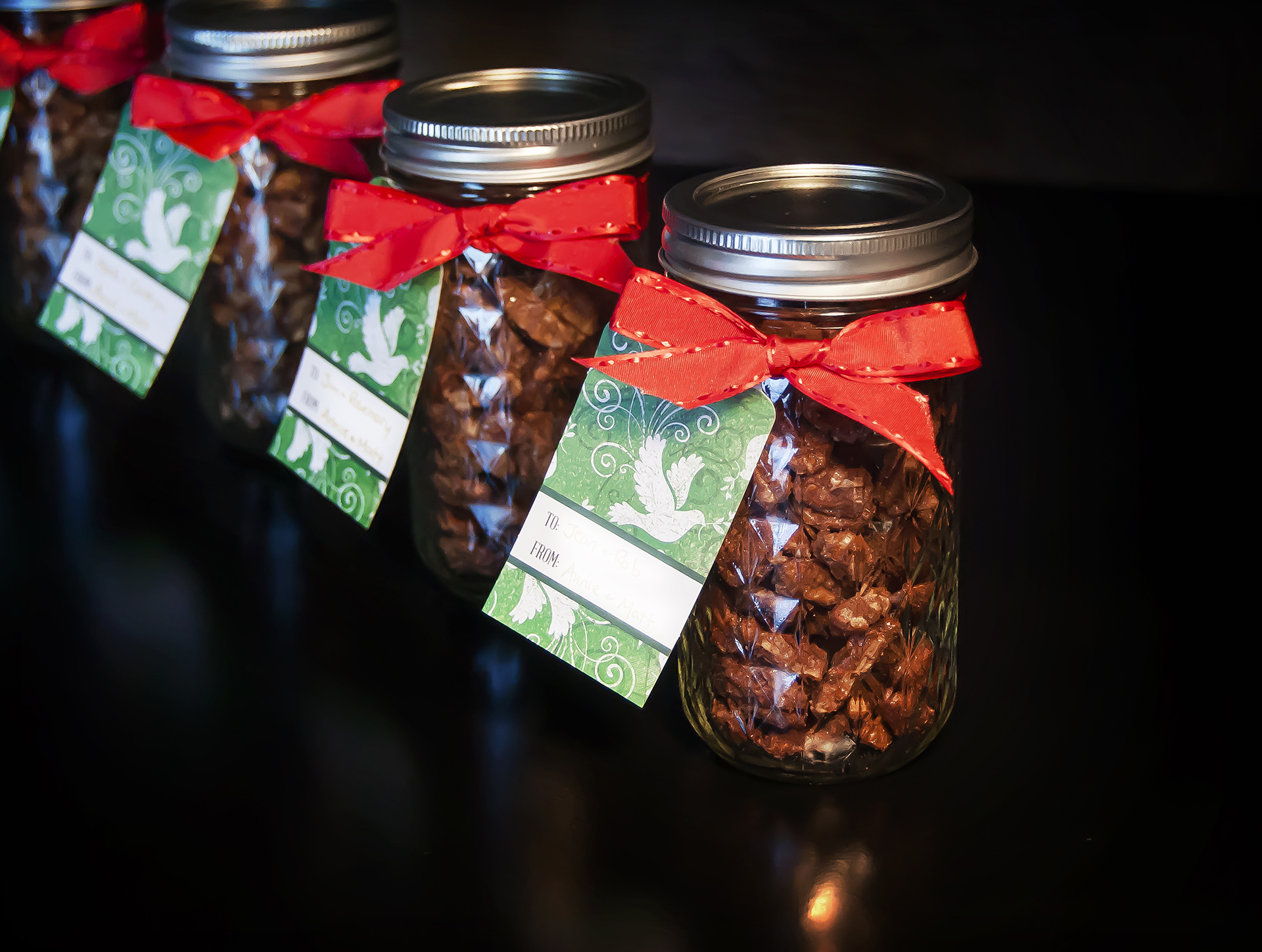 Oh yes, those are candied nuts! Sugary, salty pecans with just a hint of cayenne, to be precise. Don’t they look delicious?!? I found the recipe over at Smitten Kitchen and after a quick trip to Target for some walnuts and pecans we were ready to start cooking. These candied nuts are really easy to make, by the way. We simply coated the nuts with egg white, stirred in the sugars and spices, and baked them in the oven for 30 minutes. After the nuts cooled completely I packaged them in jelly jars with a red bow and they were ready for gifting!